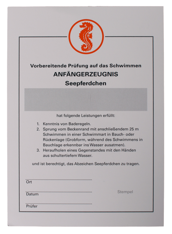 De Zeepaardje-zwembadge wordt verkregen door van de zwembadrand in het water te springen en 25 m te zwemmen. Daarna moet men in schouderdiep water de handen boven water kunnen houden. Materiaal: 100% polyester.